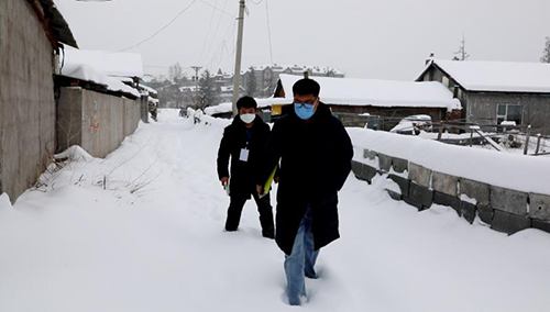 2月17日,長白山地區(qū)迎來了入冬以來規(guī)模最大的一場大雪,這為第二天的排查工作增添了不小困難。清早,雪花還沒有停止,漫天白雪里,我們依然聽到了“咯吱咯吱”的踩雪聲,原來股份公司的志愿者一早就已經(jīng)趟著膝蓋深的積雪,來到指定區(qū)域進(jìn)行入戶排查登記。天寒地凍、大雪紛飛,雪水濕透了襪子,寒風(fēng)刺痛著臉頰,也不能阻擋股份人和全區(qū)人民一道戰(zhàn)勝疫情的信念和決心。